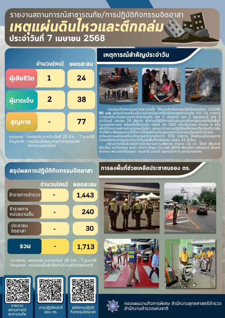 รายงานสถานการณ์สาธารณภัย ประจำวันที่ 7 เม.ย.68 7 เมษายน 2568 โดย police / ข่าวประชาสัมพันธ์,ข่าวฝากประชาสัมพันธ์ จำนวนผู้เข้าชม : 77 Facebook iconFacebookTwitter iconTwitterLINE iconLine
