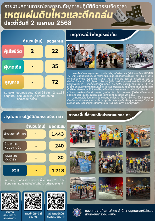 ายงานสถานการณ์สาธารณภัย ประจำวันที่ 2 เม.ย.68 2 เมษายน 2568 โดย police / ข่าวประชาสัมพันธ์,ข่าวฝากประชาสัมพันธ์ จำนวนผู้เข้าชม : 72 Facebook iconFacebookTwitter iconTwitterLINE iconLine